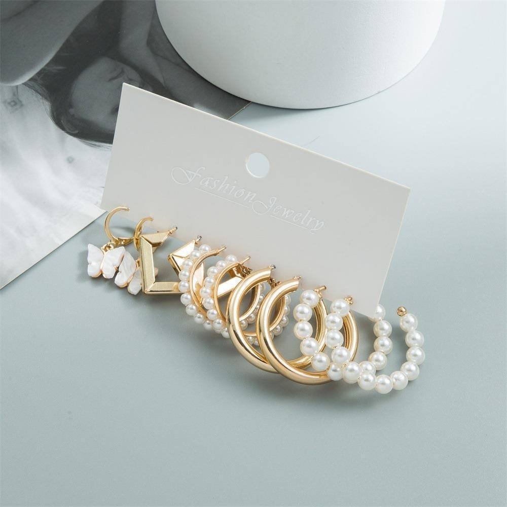 5 Pair- Korean Trendy Pearl Stud and Stone combination Earrings Set- E142